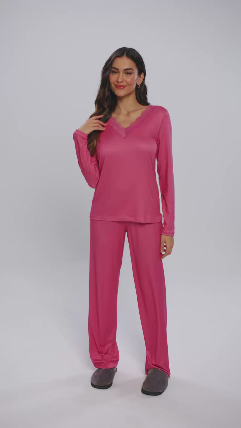 Pijama manga longa feminino em malha Peach Touch, com detalhes de renda no decote.